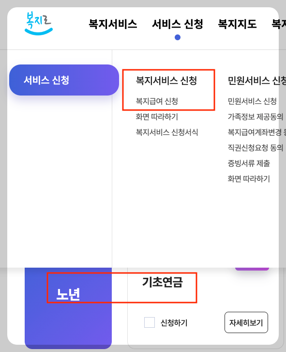 [복지로 로그인 > 서비스 신청 > 복지서비스 신청> 복지급여 신청> 노년_기초 연금] 클릭합니다.